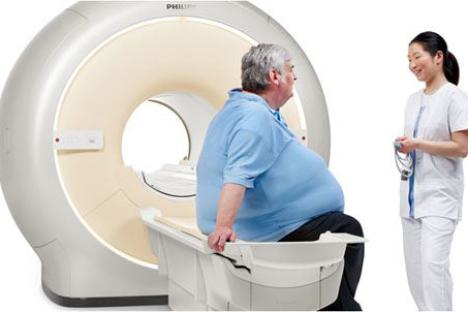 Der weite Magnetdurchmesser von 72 cm erlaubt auch die Untersuchung voluminöser Patienten. Die Tragfähigkeit der Untersuchungsliege limitiert nicht die Untersuchungsmöglichkeit.